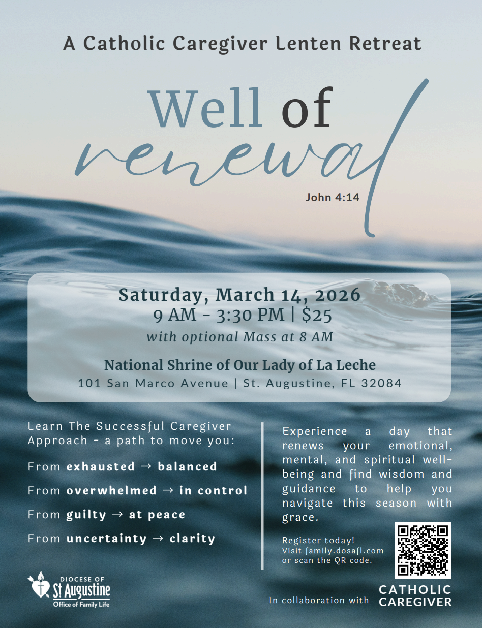Experience a day that renews your emotional, mental and spiritual well-being and find wisdom and guidance to help you navigate this season with grace. The retreat will take place on Saturday, March 14, from 9 a.m.- 3:30 p.m. with an optional welcoming Mass at 8 a.m. at the National Shrine of Our Lady of La Leche at Mission Nombre de Dios, 101 San Marco Ave. in St. Augustine. The retreat will support those who have been caregivers in the past or are currently caring for others at home and professionally. The day will include talks, time for reflection and silence, adoration and a catered lunch. For details, please visit the resource page for caregivers at https://dosafl.com/office-of-family-life/caregivers/.