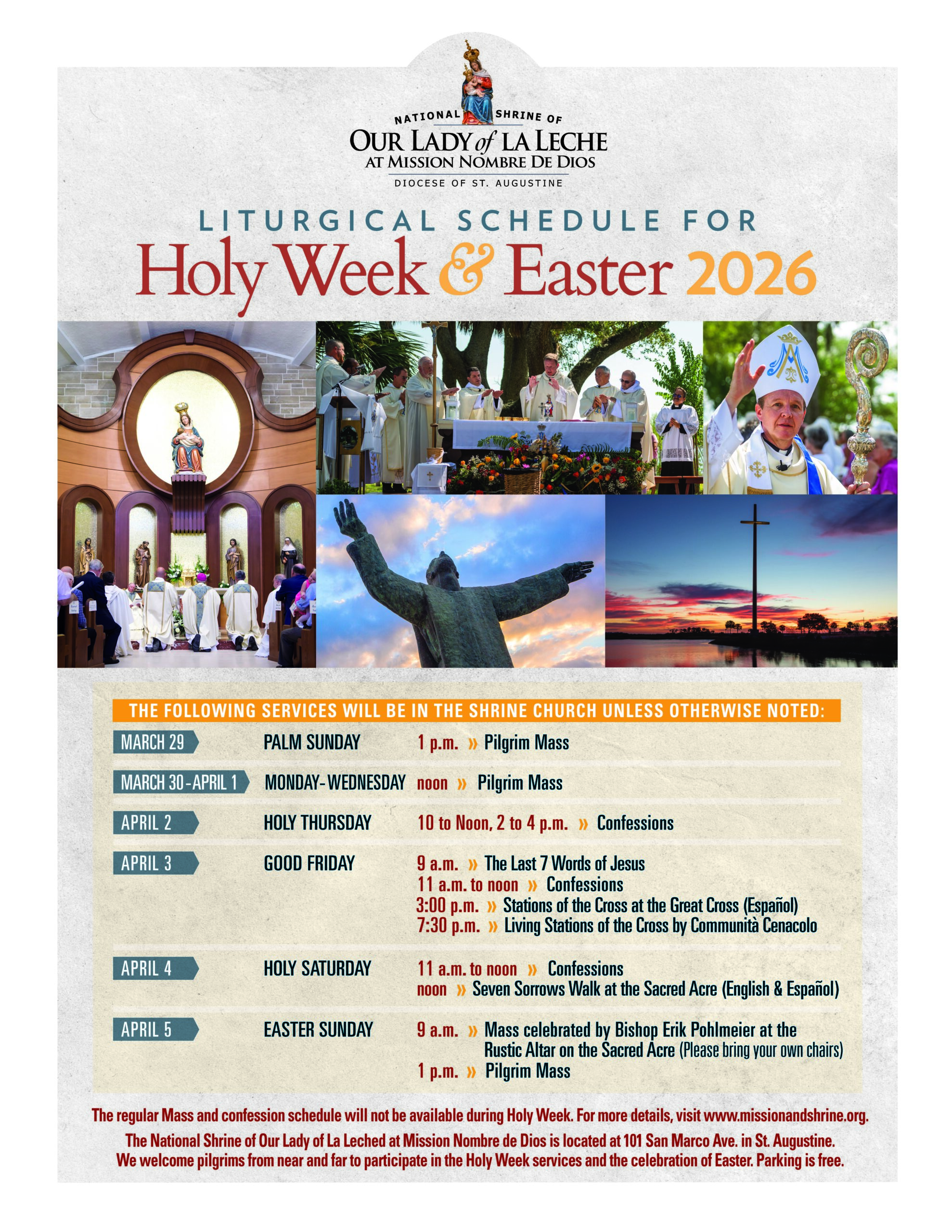 See our full schedule below of Holy Week and Easter liturgies at the National Shrine of Our Lady of La Leche. All are welcome to join us as we walk with Christ through his Passion, death and glorious Resurrection.